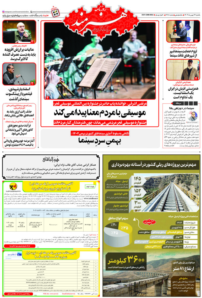 روزنامه «هنرمند» یکشنبه 26 بهمنماه ۱۴۰۴