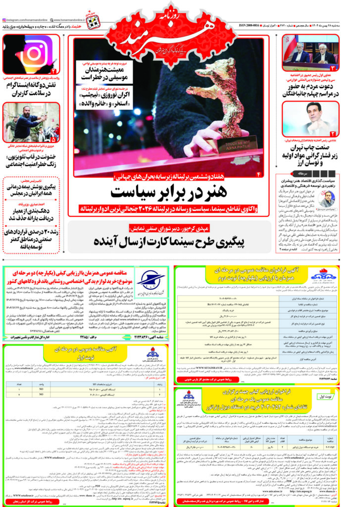 روزنامه «هنرمند» سهشنبه 28 بهمنماه ۱۴۰۴