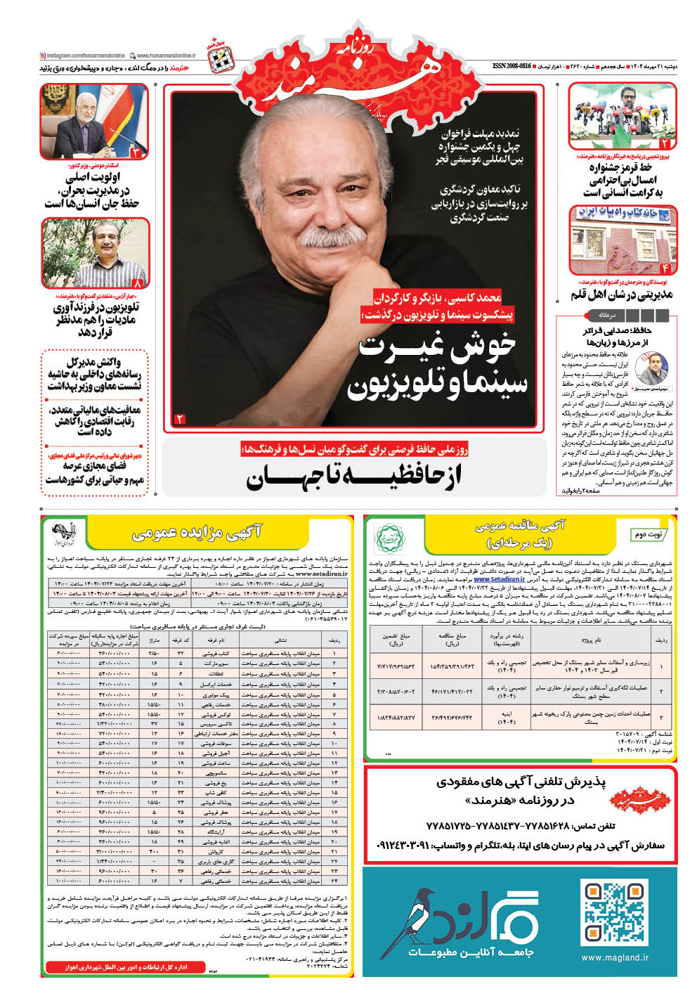 روزنامه «هنرمند» دوشنبه 21 مهرماه ۱۴۰۴