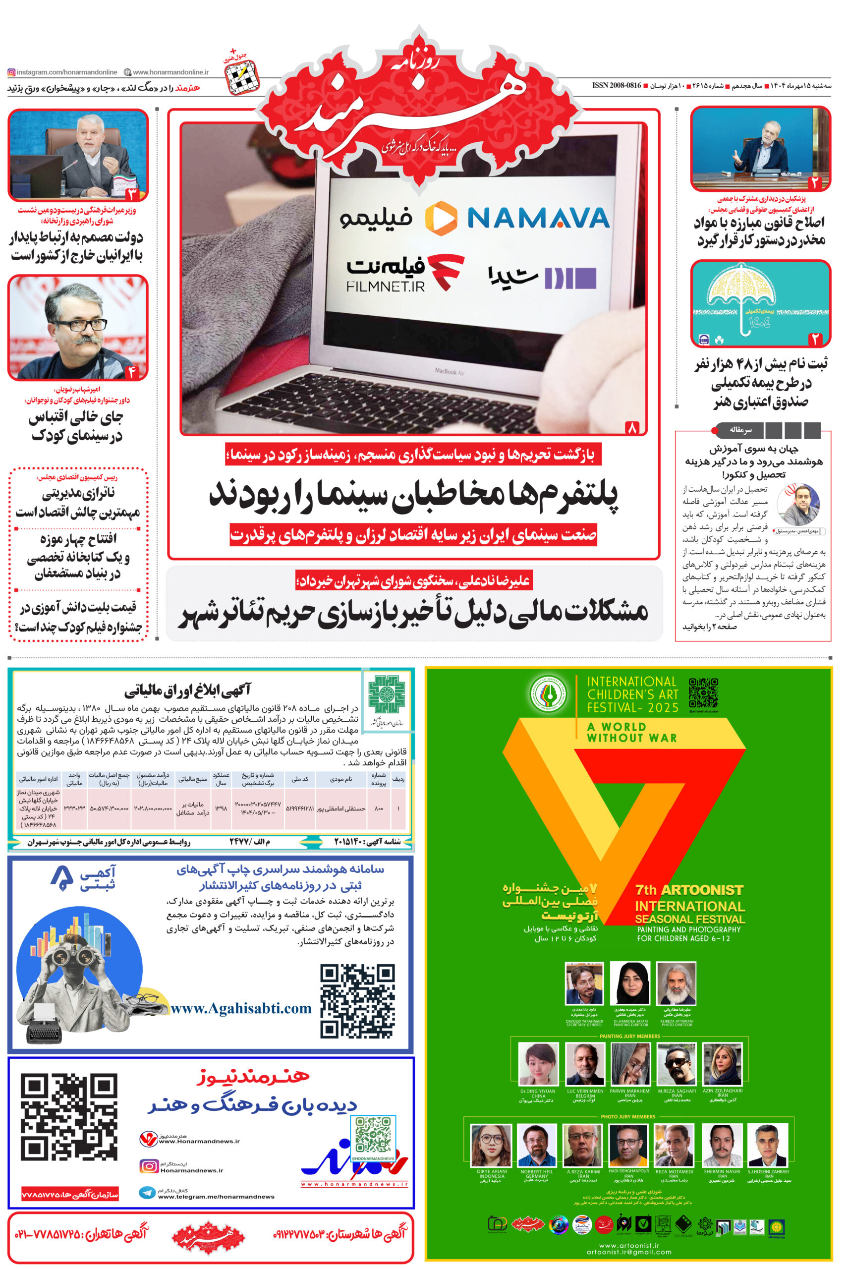 روزنامه «هنرمند» سهشنبه 15 مهرماه 1404