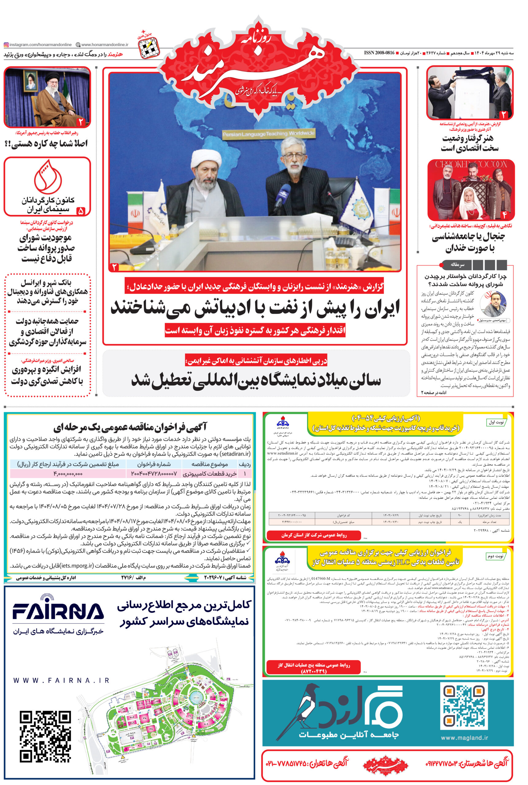 روزنامه «هنرمند» سهشنبه 29 مهرماه ۱۴۰۴