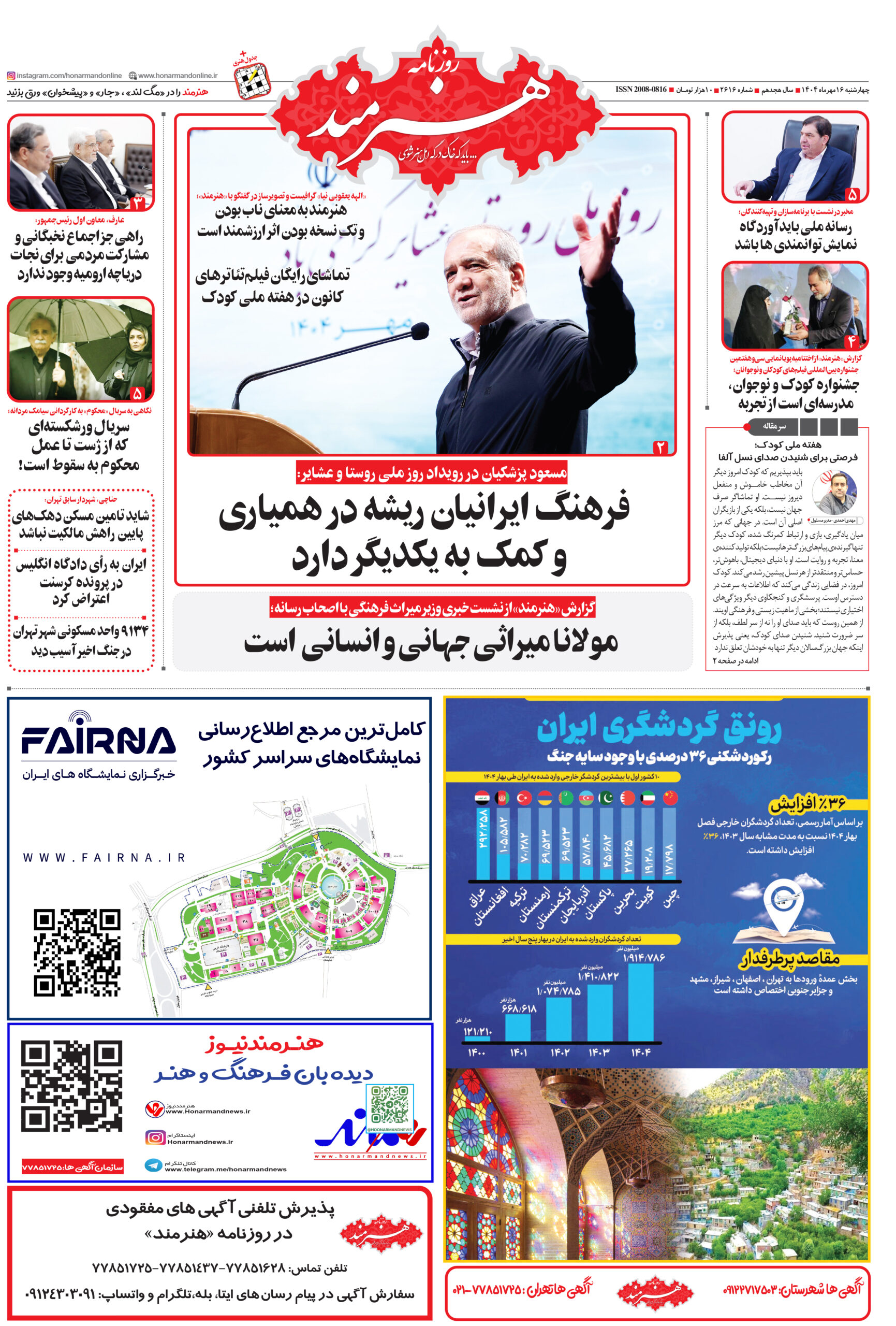 روزنامه «هنرمند» چهارشنبه 16 مهرماه 1404