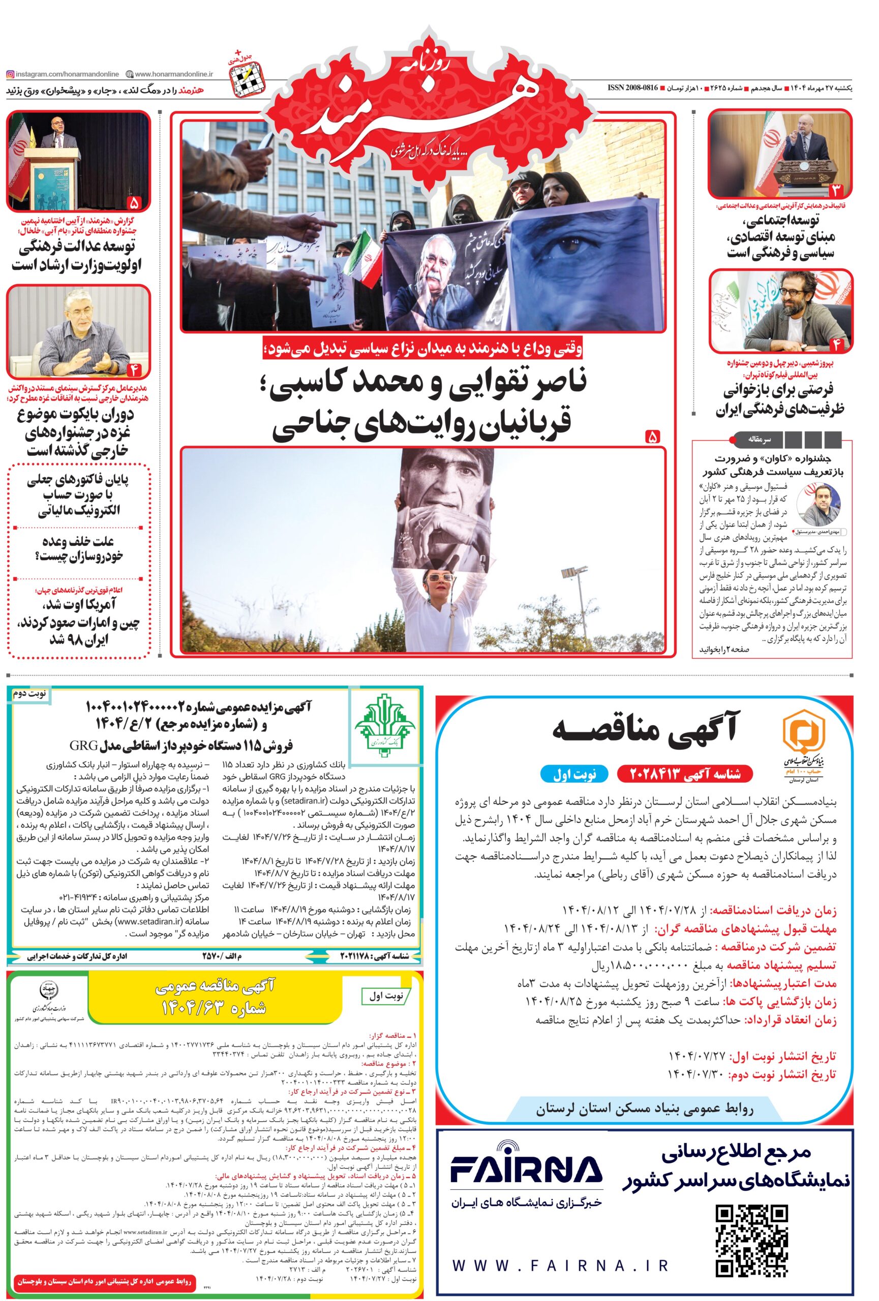روزنامه «هنرمند» یکشنبه 27 مهرماه ۱۴۰۴
