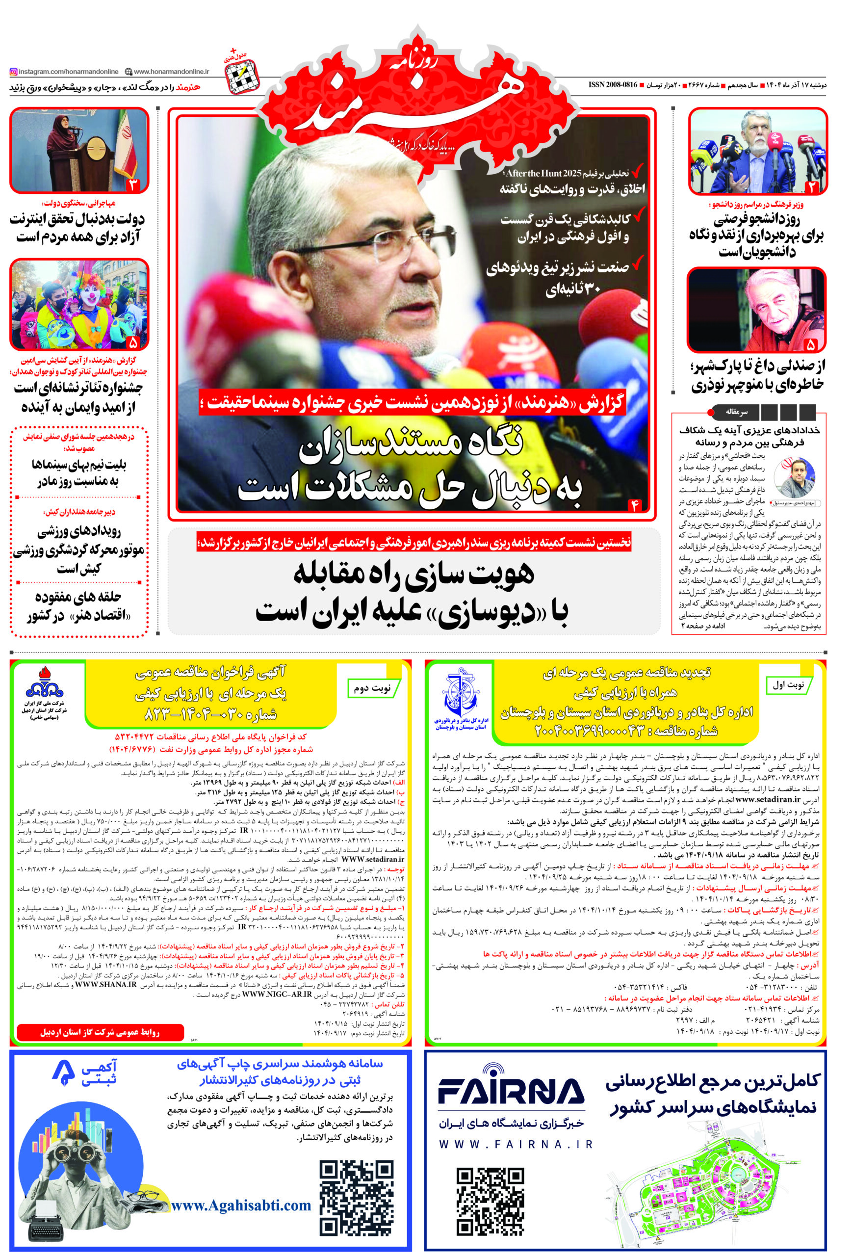 روزنامه «هنرمند» دوشنبه 17 آذرماه ۱۴۰۴