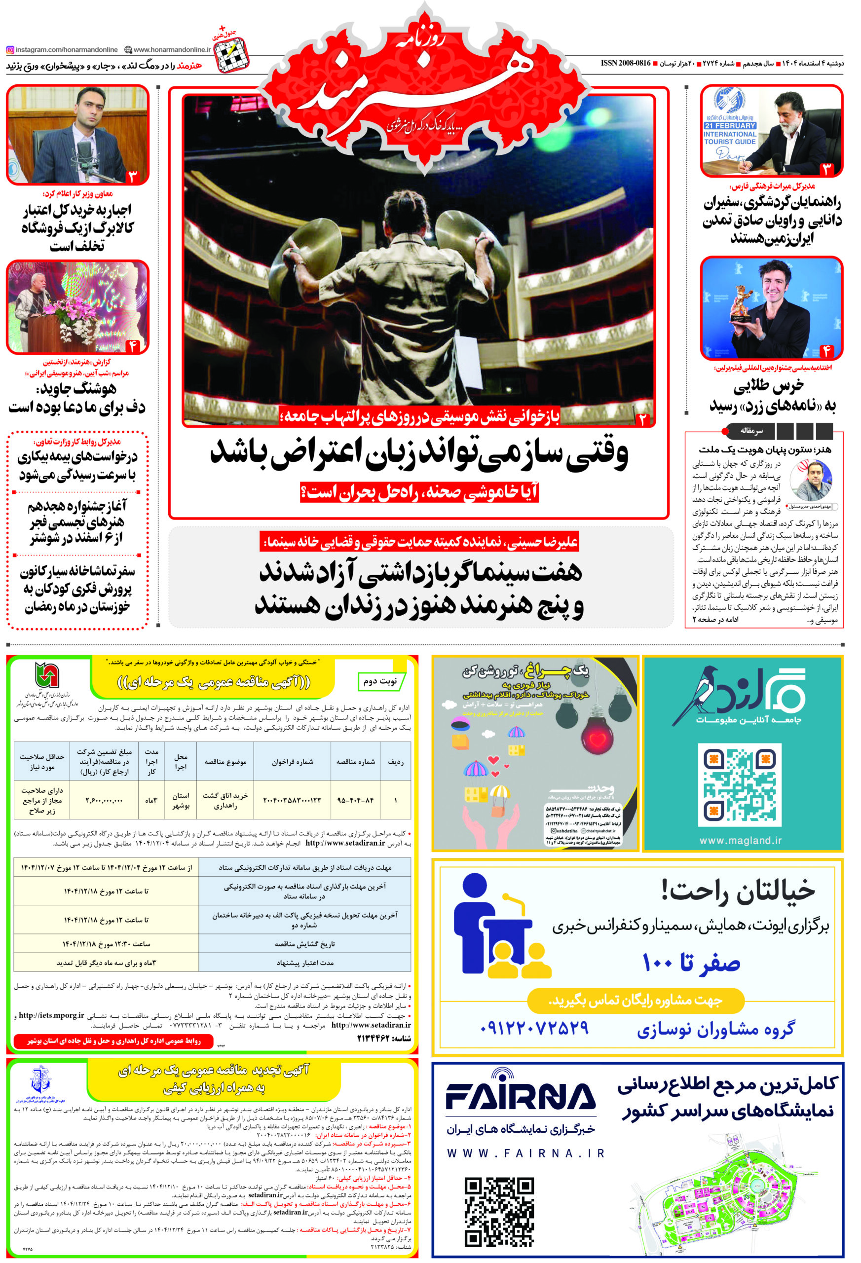 روزنامه «هنرمند» دوشنبه 4 اسفندماه ۱۴۰۴