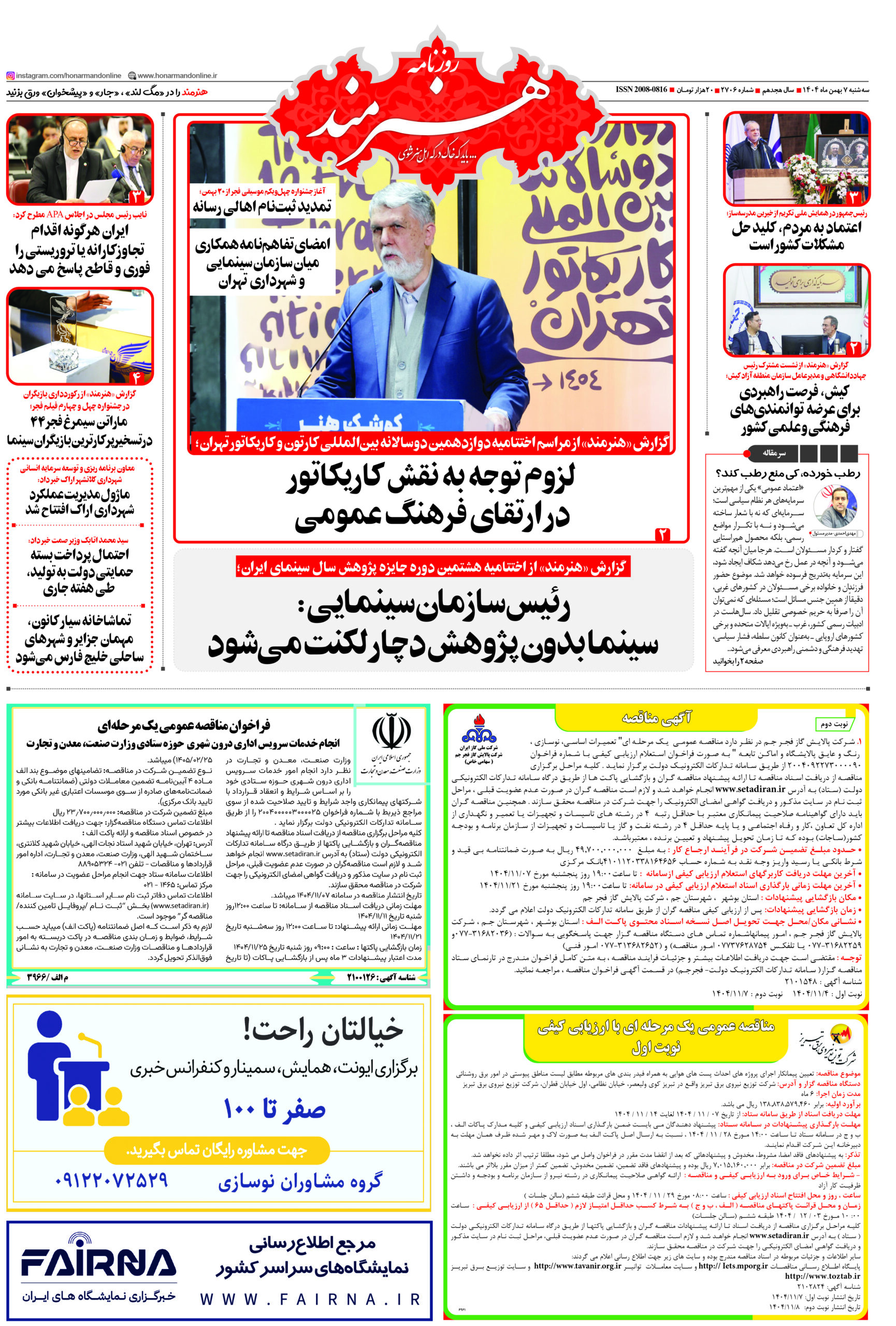 روزنامه «هنرمند» سهشنبه 7 بهمنماه ۱۴۰۴
