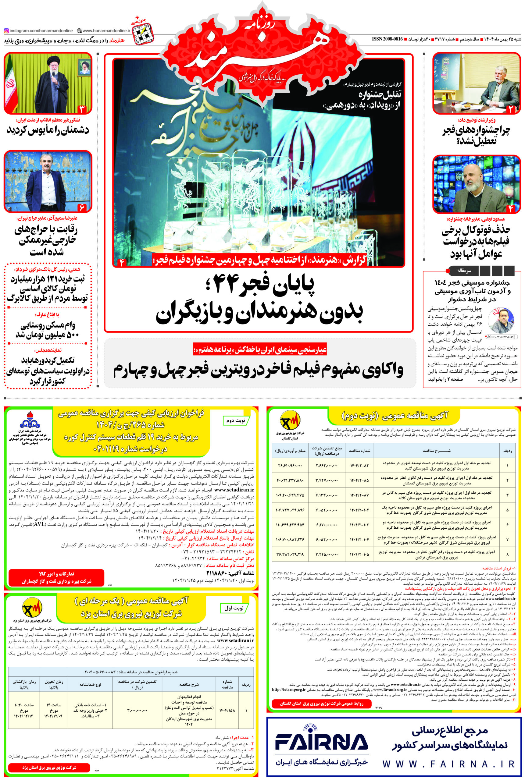 روزنامه «هنرمند» شنبه 25 بهمنماه ۱۴۰۴