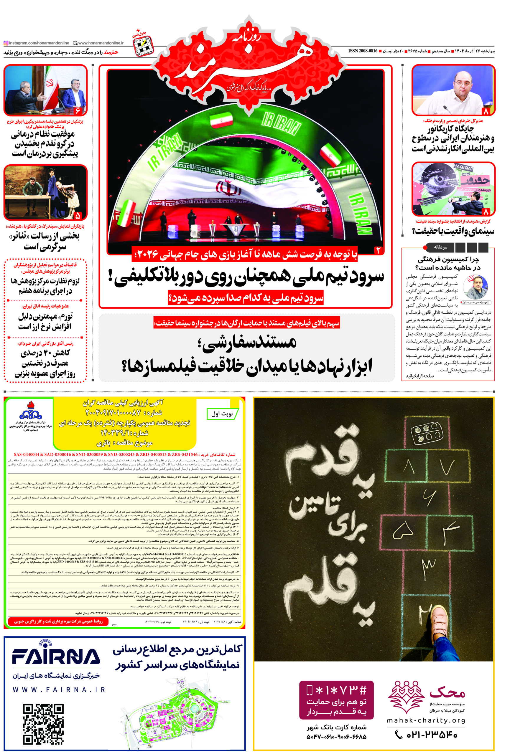 روزنامه «هنرمند» چهارشنبه 26 آذرماه ۱۴۰۴