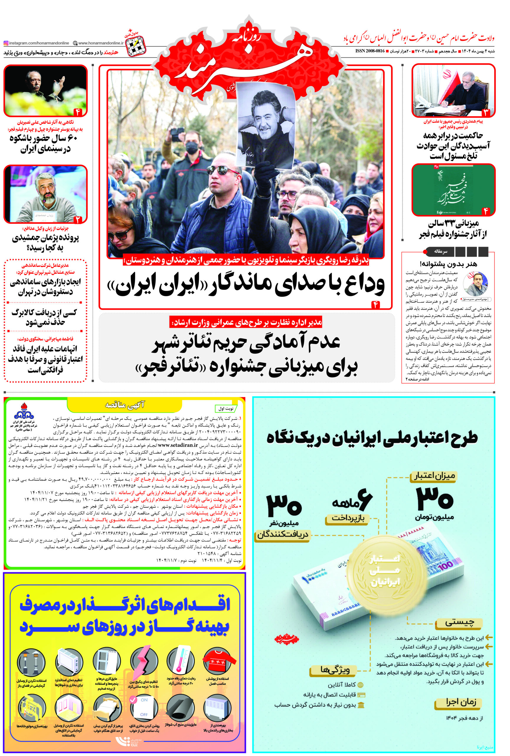 روزنامه «هنرمند» شنبه 4 بهمنماه ۱۴۰۴