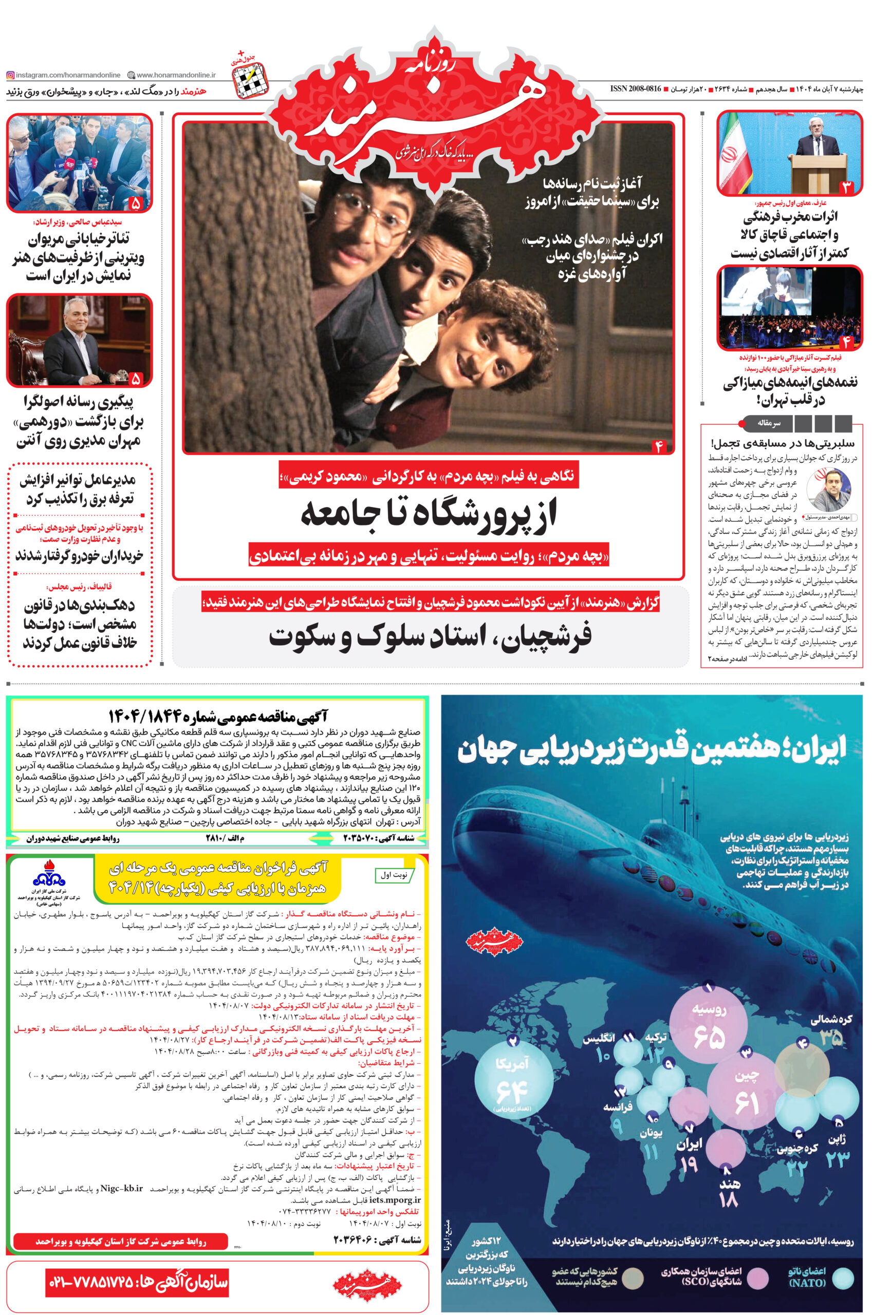 روزنامه «هنرمند» چهارشنبه 7 آبانماه ۱۴۰۴